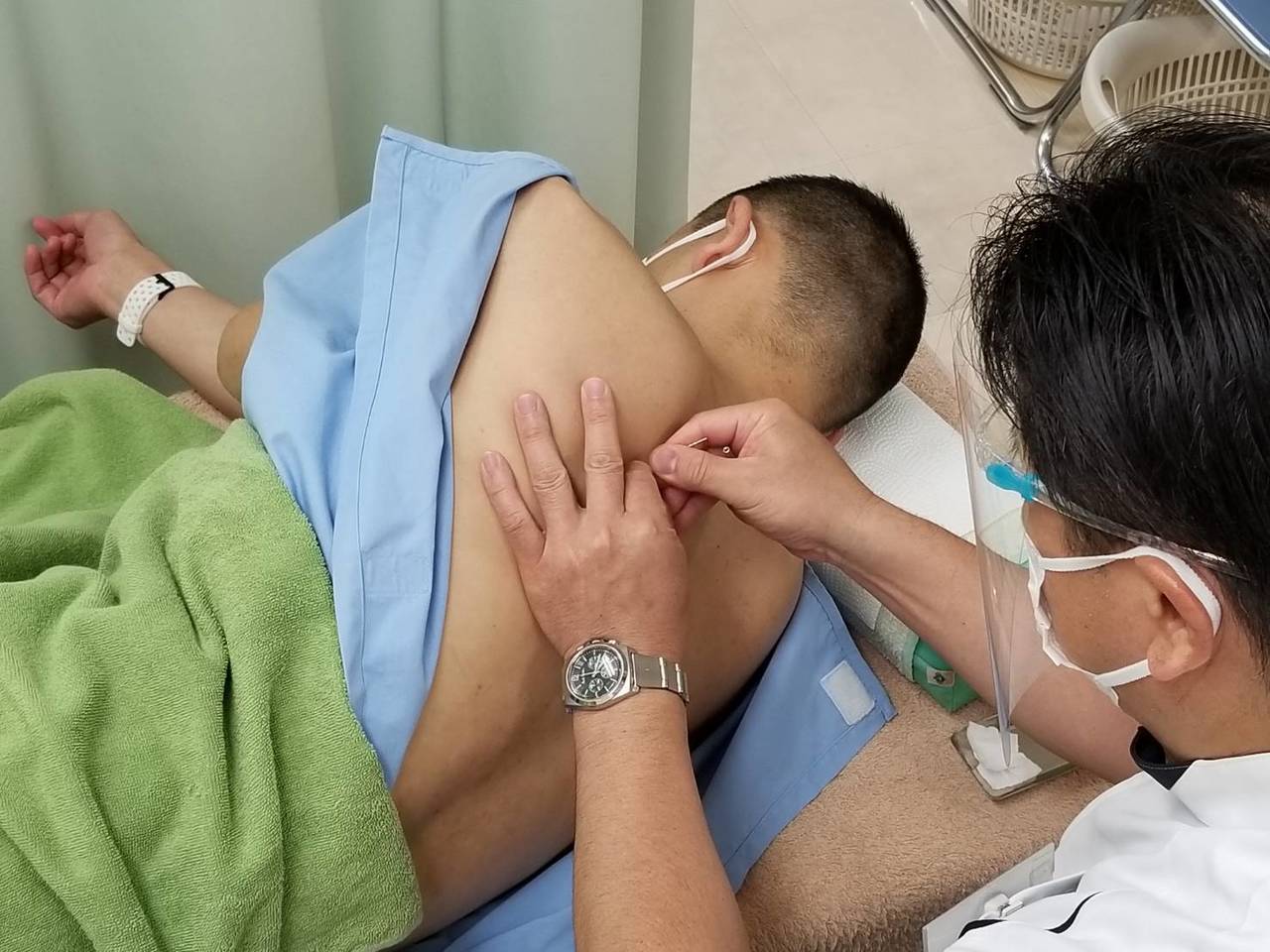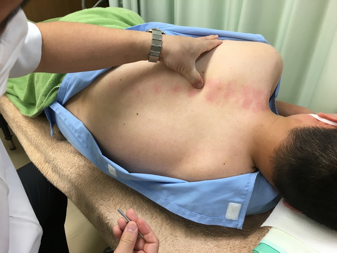 首~肩、背中にかけての一本鍼治療にて筋緊張を改善し、加えて顔面部への鍼(置鍼)とスーパーライザーEX(3点に照射➡❶顔面部❷茎乳突孔❸星状神経節)を行うことで全身の血流を促進させ顔面神経の機能回復を目指します。
