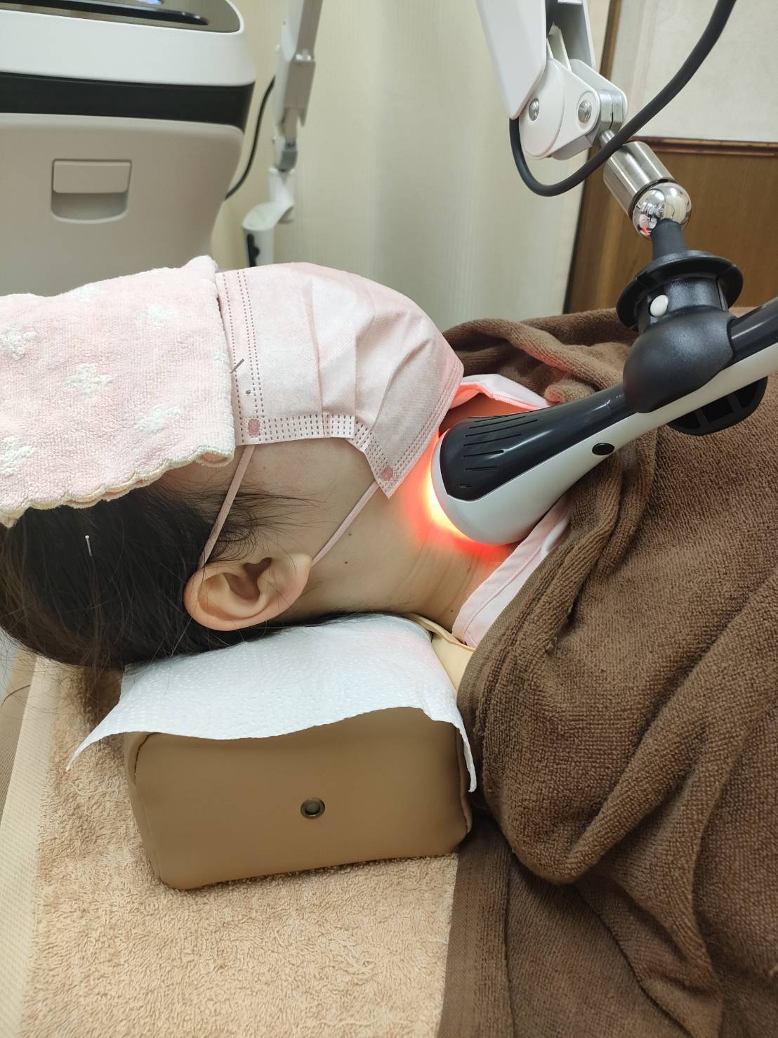 当院では、一本鍼治療で首・肩・背中のこわばりを緩めたあとに、スーパーライザーEXを併用します。